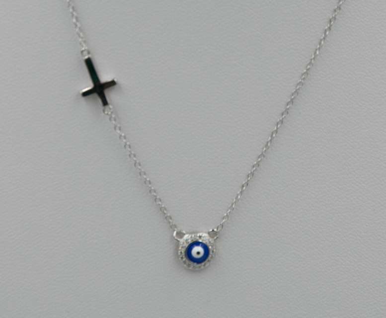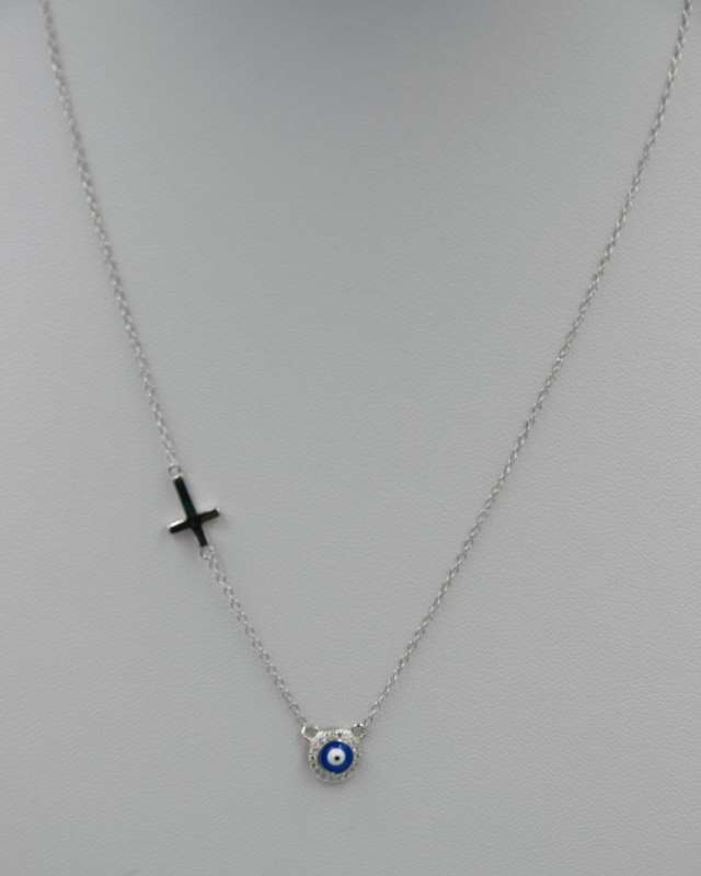 Necklace with chain and integrated elements, with cross and target with zircon.