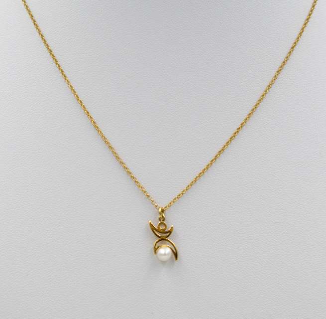Handmade women’s necklace chain with hanging element and cultured pearl.