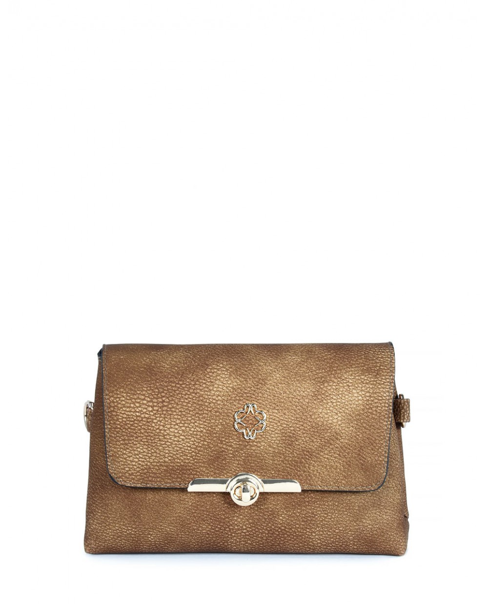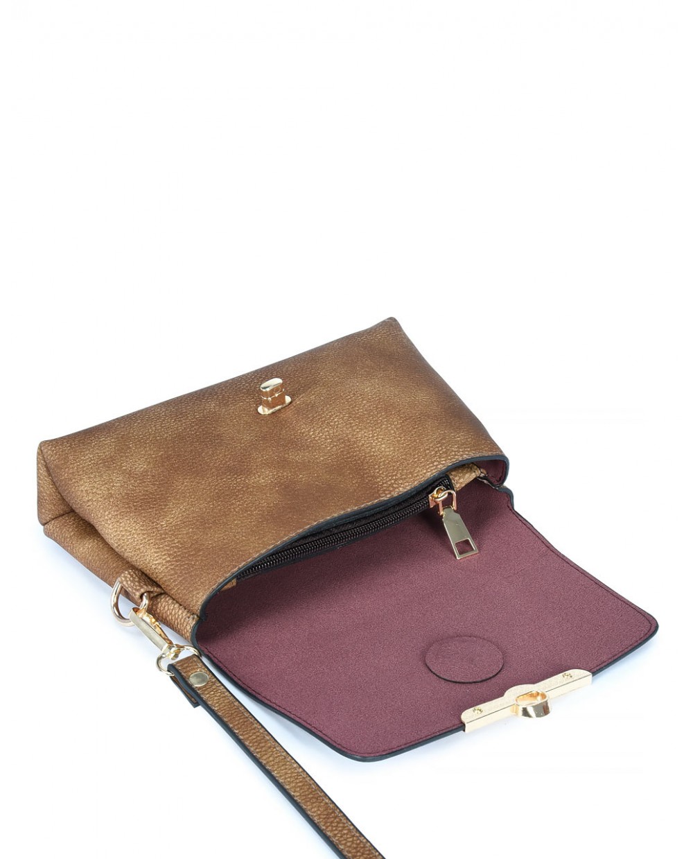 Crossbody bag with brown-gold lid with matte shine, closes with a metal clasp and is accompanied by a brown-gold strap. Inside it has 2 areas with a partition-pocket in the middle with a zipper. Metallic elements in light gold shade.