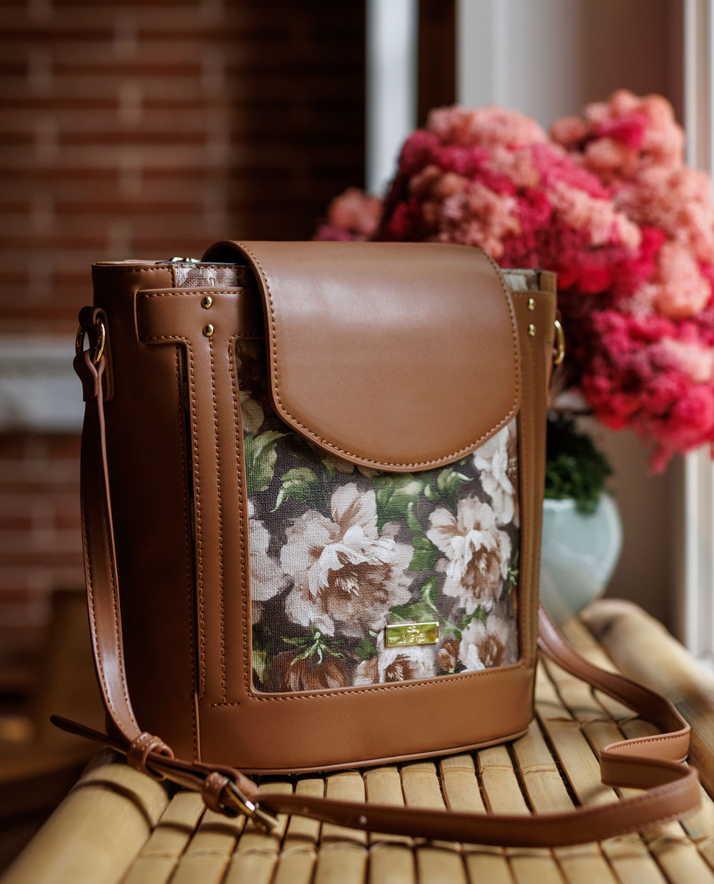 Τσάντα χιαστί καφέ ανοιχτό σε συνδυασμό με φλοραλ μοτίβο.